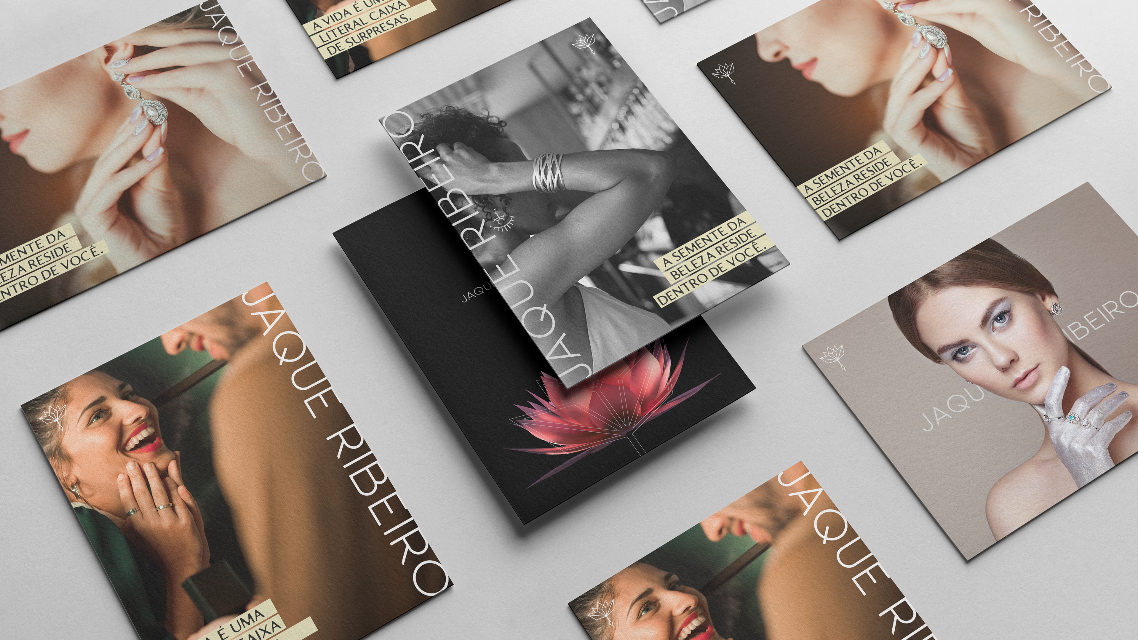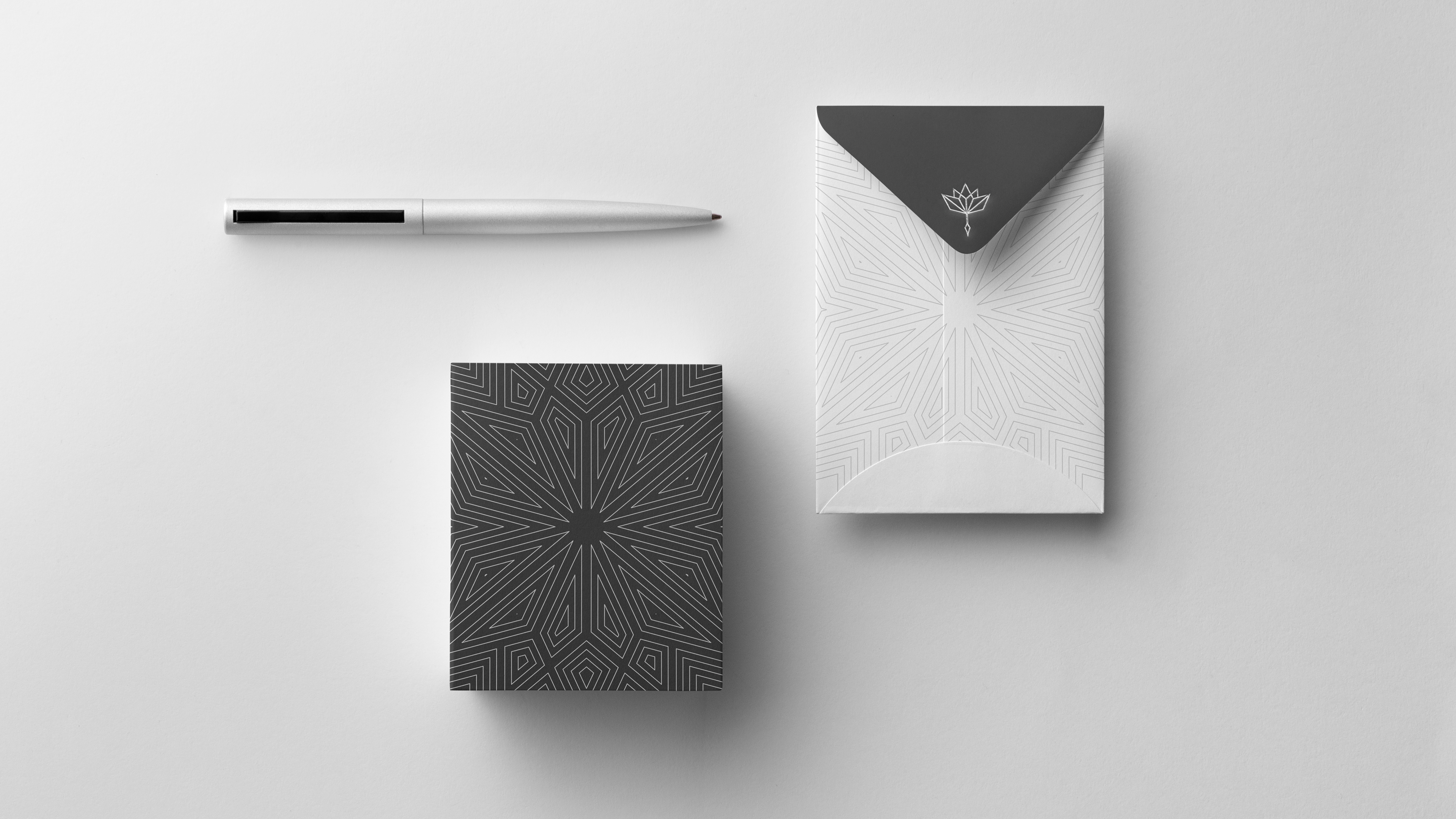 Produzimos uma identidade forte, resiliente e equilibrada inspirada na flor de lótus branca, com uma forma estilizada geométrica, externando o mais puro equilíbrio, sutileza e harmonia, com a paleta de cores básica preto e branco gerando combinações neutras e sofisticadas, tipografia Sans Serif com traços firmes e um símbolo responsivo que carrega a mesma resitência que a semente da Lótus possui.